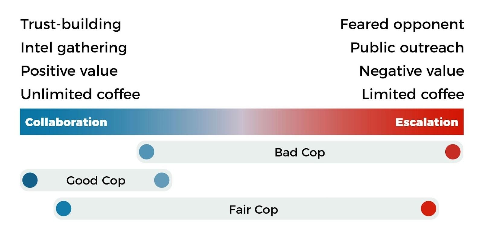 Another issue relates to coordination costs. If the good cop and the bad cop are working together, a lot of alignment work may be required, and disagreements around strategy or tactics can also arise.